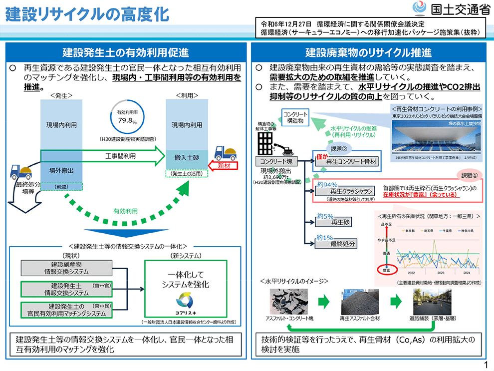 同省では目指す方向性として、“質”を重視した建設リサイクルを推進することを提示。すでに建設廃棄物の約95%は再生資材となっているが、現状で把握できていない再生資材についても利用状況などを適切に把握する。さらに2024年に実施した建設副産物実態調査の結果を踏まえ、指標・目標値を検討する方針だ。