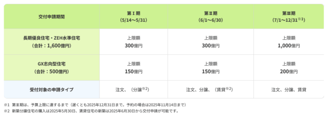 第Ⅰ期および第Ⅱ期の上限額は、長期優良住宅・ZEH水準住宅300億円、GX志向型住宅が150億円。第Ⅲ期は長期優良住宅・ZEH水準住宅1000億円、GX志向型住宅が200億円。第Ⅰ期、第Ⅱ期で交付申請額が予算上限に達しなかった場合は次期に繰り越しとなる。