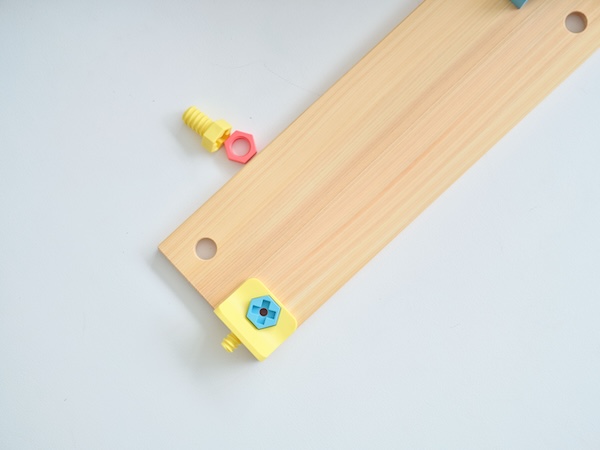 カラフルな高強度ナイロン樹脂製のボルト・ナットと⽊材パーツを組み合わせ、本格的な家具をつくることができる。