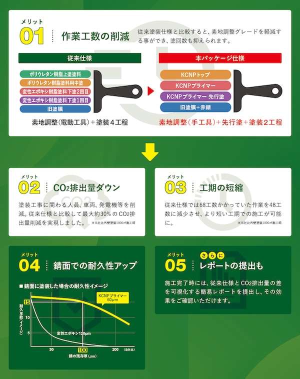 従来の塗装仕様では電動工具による素地調整+塗装4工程が必要だったが、工数を削減し、手工具による素地調整+プライマー先行塗り+塗装2工程とすることで工期を4日短縮した。