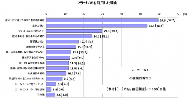 フラット35を利用した理由は、「金利上昇に備えて将来の返済額を確定」が59.6%で最も多く、次いで「金利が低い」(53.6%)、「フラット35Sを利用したい」(29.8%)と続いた。