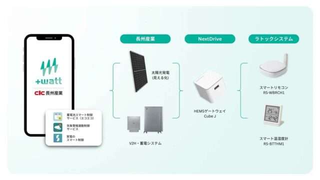 長州産業(山口県山陽小野田市)、NextDrive(東京都港区)、ラトックシステム(大阪市)の3社は5月8日、共同開発による新たなHEMSサービス「+watt(プラスワット)」の提供を開始すると発表した。