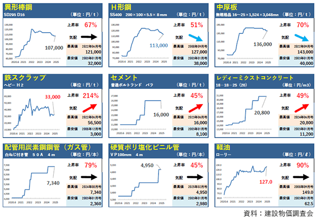 品目別(東京)では、前月との比較で「鉄スクラップ」(3万3000円/t)の価格が上昇。「H形鋼」(11万3000円/t)、「ストレートアスファルト」(10万6000円/t)の価格が下落した。今後の見通しでは、「鉄スクラップ」「セメント」「レディーミクストコンクリート」などで上昇、「H形鋼」「中厚板」「ストレートアスファルト」で下落が見込まれる。(※カッコ内は東京での価格)