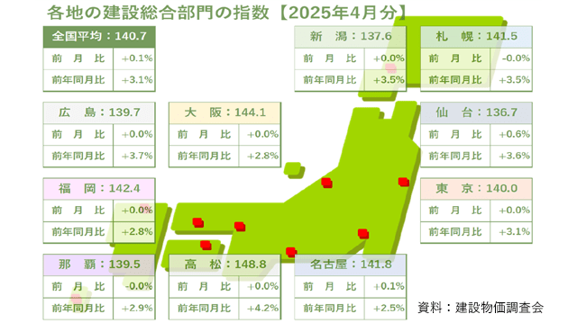建設物価調査会が5月2日公表した、2025年4月分の建設物価建築費指数(※)の動向は、建設総合平均が140.7で前月比0.1%(0.1ポイント)の増加となり、5カ月連続で上伸した。