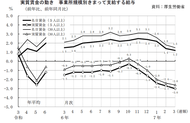 全産業平均(※1月に調査対象事業所の部分入替えを実施)は現金給与総額が30万8572円(同2.1%増)となり、39カ月連続の増加。一方で、消費者物価指数が前年同月比で3.6%上昇したことから、実質賃金指数(※名目賃金指数を消費者物価指数で除して算出)は同1.5%減の87.2となった。