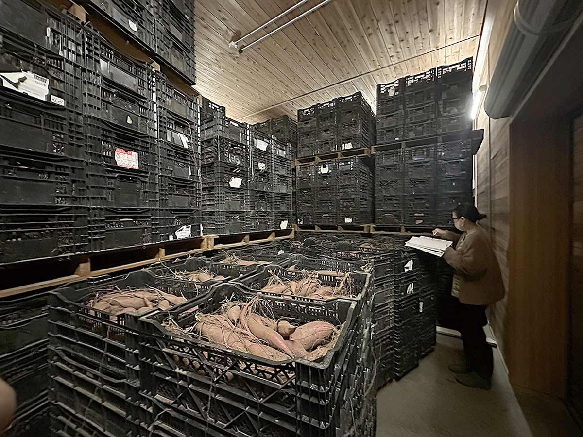 | ユースフルハウスによる農サツマイモ用倉庫の事例(左)。サツマイモ用倉庫の内部。適切な温度で出荷前に熟成する(右) | |