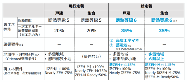 再エネを含む一次エネルギー削減率の要件も一部変更し、ZEH+は100%から115%に引き上げた。新たな定義による認証は、27年度から開始する予定。