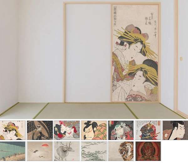 日本画はふすま1〜4枚に対応する37デザインを用意しており、1枚画デザインを組み合わせたり、4枚組デザインから好きな1枚を使うこともできる。