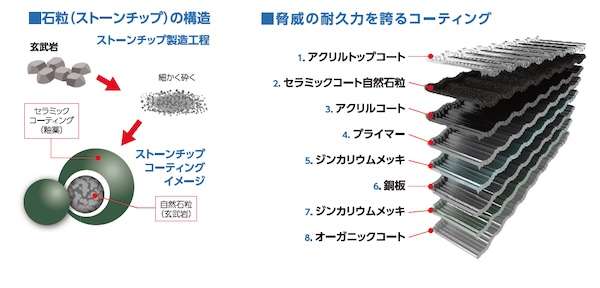 鋼板基材で、ガラス質の釉薬コートを高温焼成した自然石付きの金属屋根材。約6kg/平米と軽量なため構造材への負担が少なく、表面のストーンチップ層が雨音を抑制し、遮熱性能も発揮する。