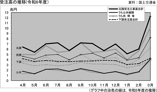 国土交通省が5月13日公表した「建設工事受注動態統計調査」(2025年3月分)によると、3月の受注高は前年同月比19.7%増の16兆5471億円となり、12カ月連続で増加した。このうち元請受注高は12兆2718億円で同21.7%の増加。下請受注高は4兆2753億円で同14.3%増加した。