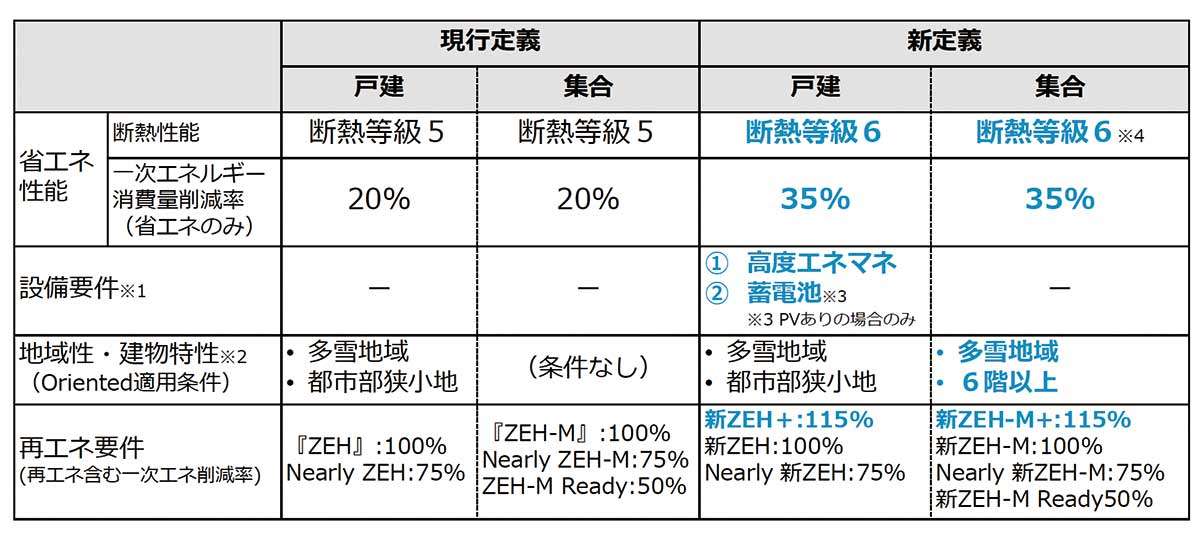 経済産業省の総合資源エネルギー調査会は5月12日の第48回省エネルギー・新エネルギー分科会省エネルギー小委員会で、ZEHの定義の見直し案を示した。断熱・省エネ性の要件を、GX志向型住宅と同じ「断熱等級6・一次エネルギー消費量削減率35%以上」に引き上げ。戸建て住宅ではさらに蓄電池と高度エネルギーマネジメントを要件に追加する[表]。