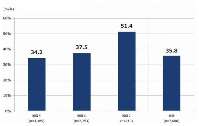 断熱等級の別に見ると、自家自給率(使用する電力に太陽光発電の自家消費が占める割合)が最も高いのは断熱等級7の51.4%。次いで等級6では37.5%、等級5では34.2%となった[グラフ1]。太陽光の発電量も等級が高いほど増えており、等級7では太陽光で発電した電力の、およそ3分の1を自家消費している。