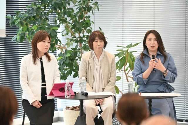 座談会は2部構成で行い、第1部には近藤建設(富山県)社長の近藤裕世さん、オフィスHanako(新潟県)社長の渡辺さゆりさん、不二電気工事(兵庫県)専務の藤田智香さんの3人が登壇。それぞれ経営の立場から、会社のビジョンやそれに基づいて進めている社員が働きやすい環境づくりへの取り組みなどについて紹介した。