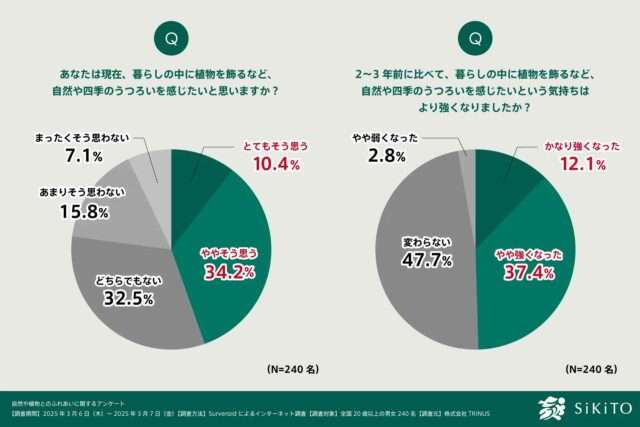 TRINUS(トリナス、東京都世田谷区)はこのほど、20歳以上の男女240人を対象に、自然や植物とのふれあいについて調査した。回答者の44.6%が「暮らしの中で自然や四季の移ろいを感じたい」と回答。さらに、自然や季節の変化を感じたい気持ちが「2~3年前より強くなった」人が49.5%とほぼ半数を占め、自然回帰志向の顕著な高まりがうかがえる結果となった。