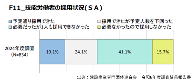 これによると、技能労働者の採用状況は「予定通り採用できた」(19.1%)、「採用できたが予定人数を下回った」(24.1%)が2割程度にとどまったのに対し、「必要だったが1人も採用できなかった」が41.1%と最も多くなった。企業規模や職種に限らず、軒並み採用が難しくなっている。