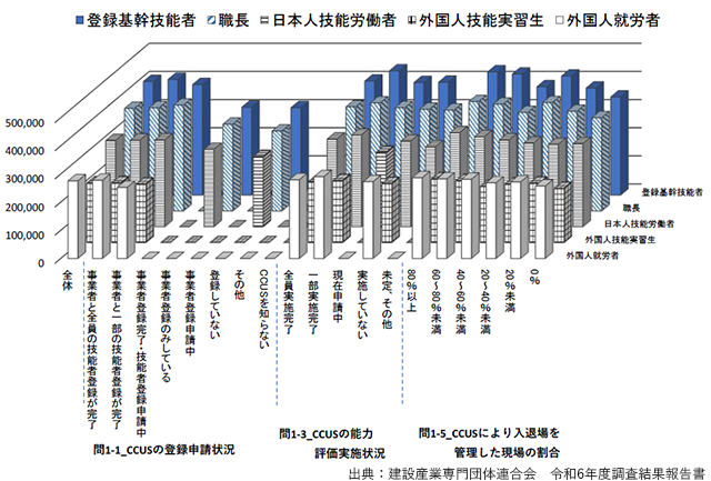 会員が雇用する登録基幹技能者の平均給与額は40万3704円。職長は36万4441円、日本人技能労働者は30万6548円、外国人技能実習生は21万2662円、外国人就労者は27万5750円となった。熟練技能を保有する立場ほど給与支給額が高い傾向が見られる。また、建設キャリアアップシステム(CCUS)の登録申請状況で比較すると、CCUSを積極的に活用している企業ほど給与水準が高い傾向が見られた。