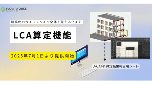BIMの普及・活用支援を行うフローワークス(愛知県名古屋市)は、建築物の設計段階から運用解体までの環境負荷を数値化するLCA(ライフサイクルアセスメント)算定機能は開発した。7月1日から、同社のBIM導入支援サービスにおける現行のBIM標準テンプレートのオプションとして提供していく。