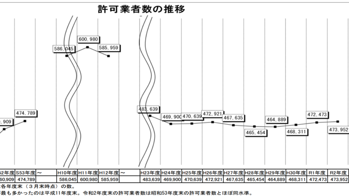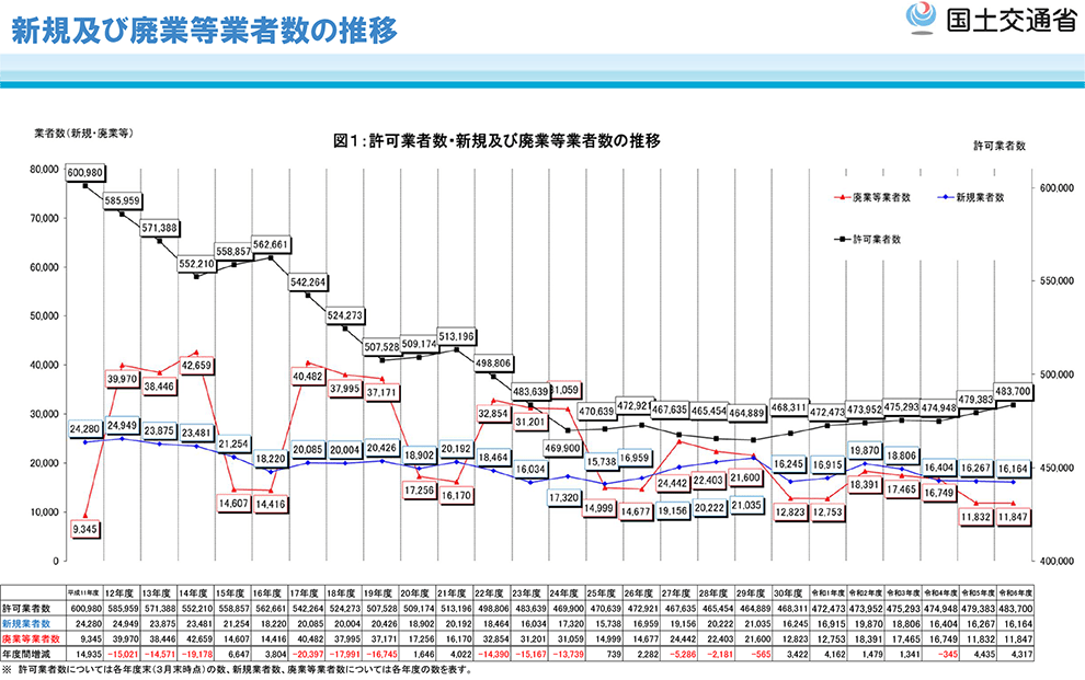 国土交通省が5月16日に発表した2024年度末の「建設業許可業者数調査結果」(PDF)によると、許可業者数は前年同月比で4317業者増え48万3700業者となった。2022年度に一旦減少したが、2年連続で増加している。一方、ピーク時の2000年と比較すると、11万7280業者の減少となっている。