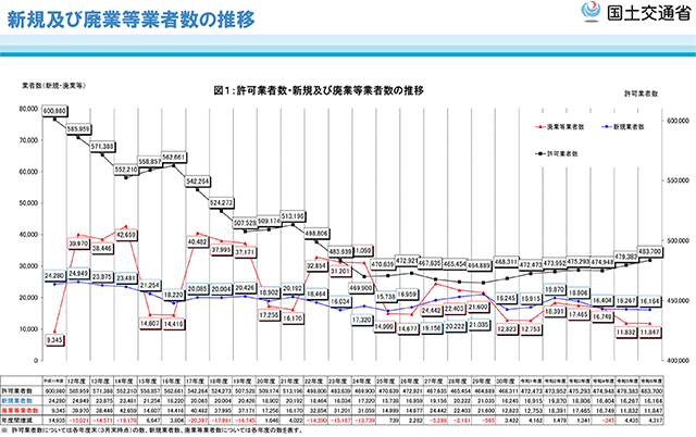 許可業者数を都道府県別に見ると、「東京都」4万4655業者、「大阪府」4万1645業者、「神奈川県」2万9464業者の順に多く、順位は昨年と同様だった。少なかったのは、「鳥取県」2145業者、「島根県」2655業者、「高知県」2964業者など。ピークだった2000年と比較して減少が目立つのは、前年に続き「秋田県」(36.4%減)、「宮崎県」(33.5%減)、「群馬県」(32.3%減)などとなっている。