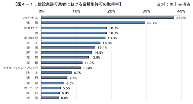 業種別では、「とび・土工工事業」18万3700業者(構成比:38.0%)、「建築工事業」14万3593業者(同29.7%)、「土木工事業」13万1889業者(同27.3%)の順に多かった。前年と比べて取得業者数が増加したのは、「とび・土工工事業」(2466業者・1.4%増)、「解体工事業」(2424 業者・3.6%増)など。減少したのは「建築工事業」(646業者・0.4%減)、「造園工事業」(87業者・0.4%減)などだった。
