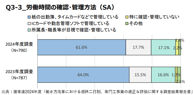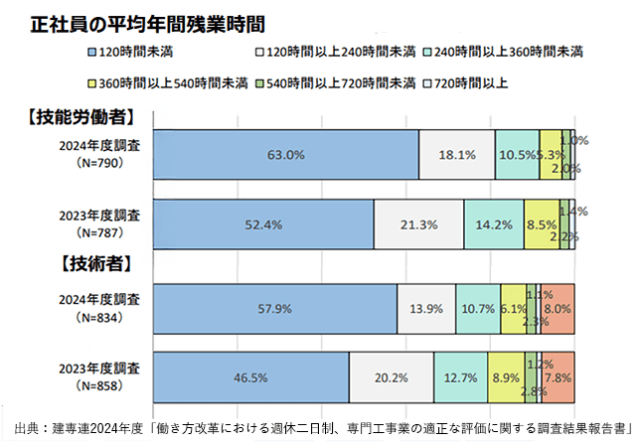 建設産業専門団体連合会(建専連)はこのほど公表した2024年度の「働き方改革における週休二日制、専門工事業の適正な評価に関する調査結果報告書」(PDF)の中で、技能労働者の労働時間や残業時間について報告した。24年4月から適用された時間外労働の上限規制への対応に苦悩する企業の様子がうかがえる結果となっている。