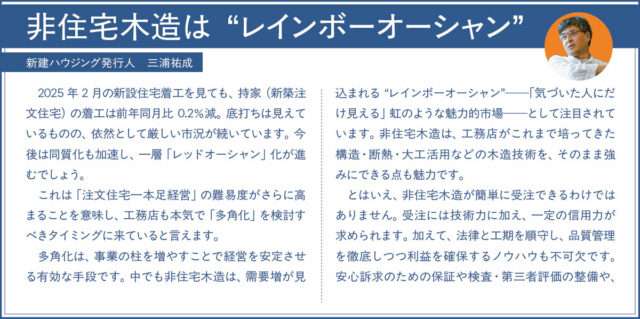 新築住宅のように10年間の瑕疵担保責任が義務付けられていない非住宅建築物の場合、事業者は発注者に対して、自社の信頼性と、建物の施工品質・性能をいかにアピールするかが受注のカギを握る。①②③のサポートメニューは、非住宅に取り組む事業者のそうした課題をカバーしつつ、国の重点施策であり今後の市場拡大が見込まれる「建築物の木造化・木質化」にも寄与する内容となっている。