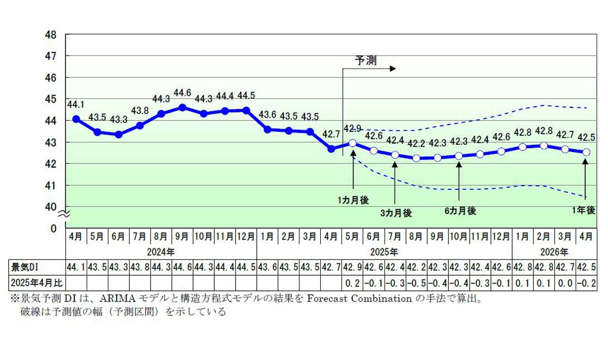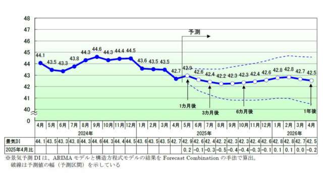帝国データバンク(東京都港区)は5月7日、4月の景気動向調査の結果を公表した。全産業の景気DIは前月比0.8ポイント減の42.7となり、2カ月ぶりに悪化。トランプ米大統領の関税政策に対する強い警戒感などが影響し、2023年2月以来の水準まで低下した。