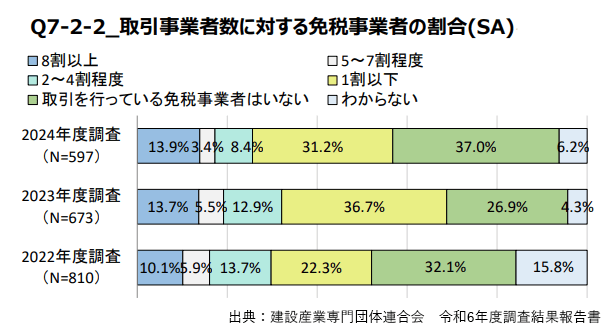 また、取引事業者数に対する免税事業者(一人親方を含む)の割合は、「いない」が37.0%で最も多く、次いで「1割以下」(31.2%)、「8割以上」(13.9%)が続いた。職業別では、大工工事業、とび・土工工事業、鉄筋工事業などで、「免税事業者と取引していない」と答えた企業の割合が高い傾向が見られた。