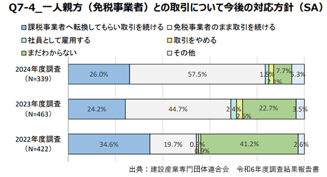 その上で、免税事業者である一人親方への対応方針を尋ねたところ、「免税事業者のまま取引を続ける」との回答が57.5%を占め、「課税事業者へ転換してもらい取引を続ける」は26.0%、「取引をやめる」は2.1%にとどまった。「免税事業者のまま取引を続ける」は前年から12.8ポイントの増加、「課税事業者へ転換してもらい取引を続ける」は1.8ポイントの増加となった。