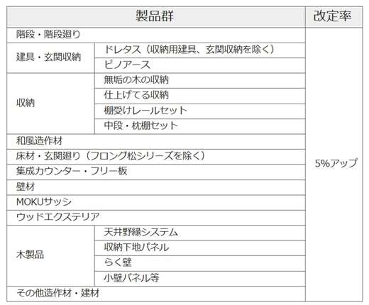 「WO」「ドレタス収納用建具」「ドレタス玄関収納」「フロングⓇ[松シリーズ]」「e・ra・bo(エラボ)」については、価格を据え置く。