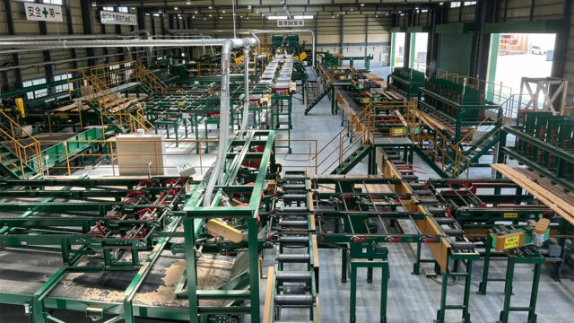 同工場は製造棟と加工棟の2棟。製材棟には、その活用が課題となっている大径木の原木(最大径60㎝)を投入できる自動製材設備を設置。木材の送材と加工は全自動ループ機能で対応し、板材を生産するツインバンドソーを組み合わせた無人の製材ラインを稼働させる。