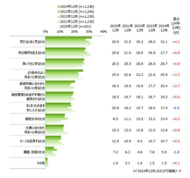 リクルート(東京都千代田区)のSUUMOリサーチセンターは5月15日、2024年の「住まいの売却検討者&実施者調査」の結果を公表した。24年に土地や住宅の売却を検討した人は全体の20.2%で、「売却を完了した」のは39.6%で4年連続の上昇となった。売却を検討した理由では「売れるときに売るため」が32.1%で、23年から4.1ポイントの増加。20年以降でも最高となった。