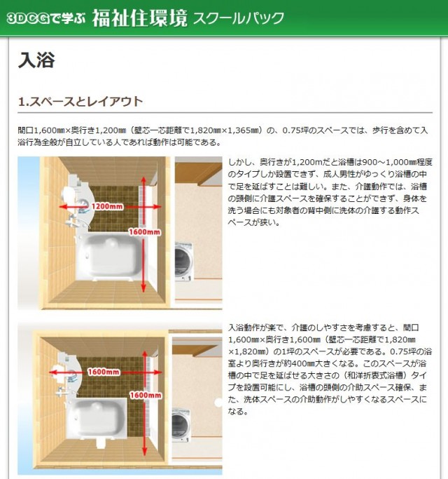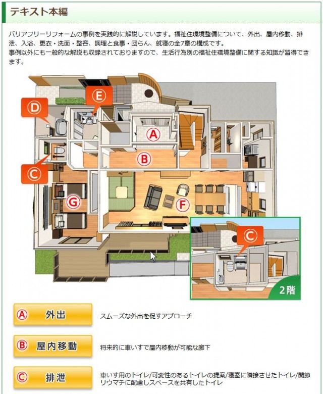 「福祉住環境コーディネーター検定試験」2級の「生活行為別福祉住環境整備の手法」に準拠した電子テキストと、その内容を住宅デザインソフト「3Dマイホームデザイナー」で空間構築して確認できる素材データをセットにしたもので、高齢者や障がい者の生活に適した間取りや設備などの空間提案を演習できる。学校教育機関向け。