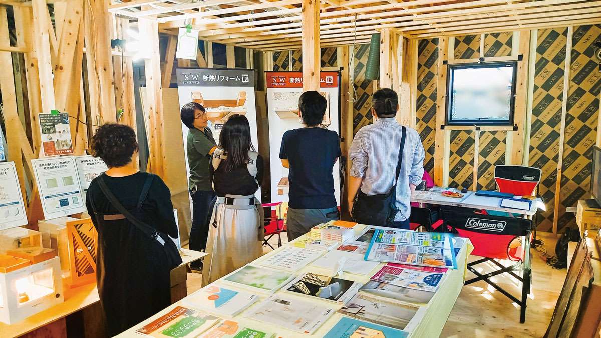 | 構造見学会の様子。写真、チラシや本、パネル、建材のモデルなど多数の資料が展示されている | |