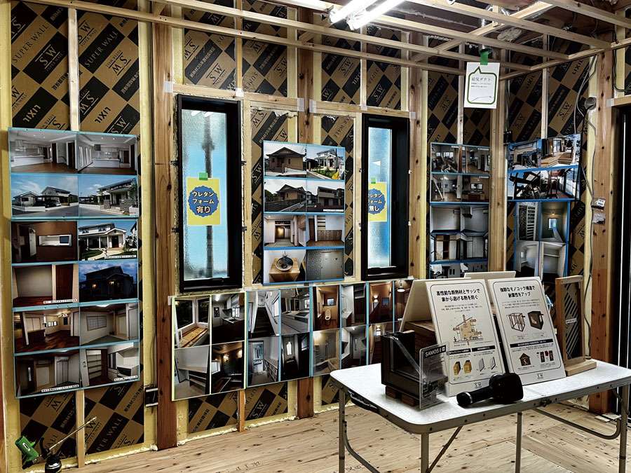 構造見学会は、性能に関わる要素を伝える場でもあるだけに力を入れる。会場には断熱材やサッシのカットモデル、結露やヒートショックなど断熱性が暮らしに及ぼす影響の説明パネル、BELS評価書のサンプル、過去の施工事例(写真)―さまざまな資料が所狭しと並ぶ。来場者が富山さんとゆっくり話をしたりアンケートを記入してもらうために、アウトドア用のいすとテーブルを持ち込み、パソコンをつなげるようモニターも必ず設置している。