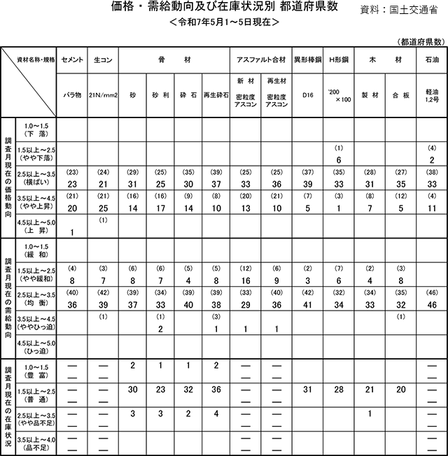 国土交通省が5月26日発表した「主要建設資材需給・価格動向調査結果」(5月1~5日に実施)によると、価格動向は生コンクリートが「やや上昇」、それ以外の資材は「横ばい」となった。需給動向はすべての資材で「均衡」、在庫状況はすべての資材で「普通」となっている。