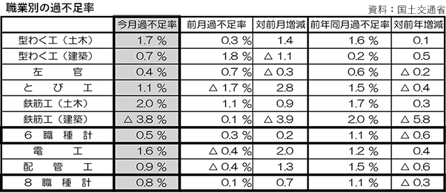 職種別では、「鉄筋工(建築)」(△3.8%)が過剰となったが、その他の職種では不足となった。「鉄筋工(建築)」は前月の0.1%の不足から過剰に転じている。中でも関東で8.4%の過剰となった。不足率が高かったのは、「鉄筋工(土木)」(2.0%)、「型わく工(土木)」(1.7%)、「電工」(1.6%)など。前月比では、「鉄筋工(土木)」は0.9ポイント、「型わく工(土木)」は1.4ポイント、「電工」は2.0ポイントそれぞれ不足幅が広がった。