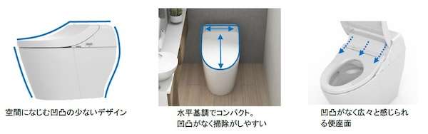 このほか、使うたびにノズルを次亜塩素酸を含む水で洗浄・除菌する「ノズルきれい」、陶器表面の凹凸をなくし高い親水性で汚れ・カビを落とす「セフィオンテクト」、渦を巻くような水流で少ない水で効率よく洗浄する「トルネード洗浄」など、従来からある清潔機能も引き続き搭載している。