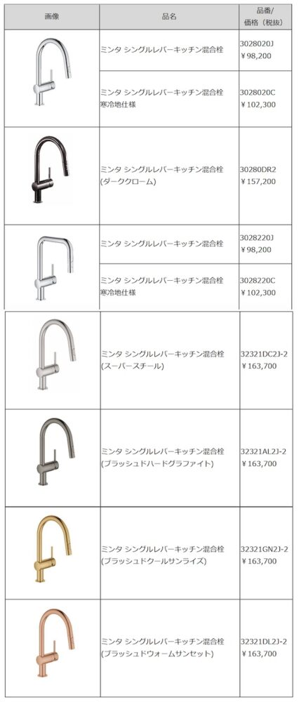 グローエジャパン(東京都港区)は、多様なスパウト形状と機能性で人気のキッチン水栓「ミンタ」シリーズに、水はね低減機能を搭載した新モデル7種類をラインアップした。