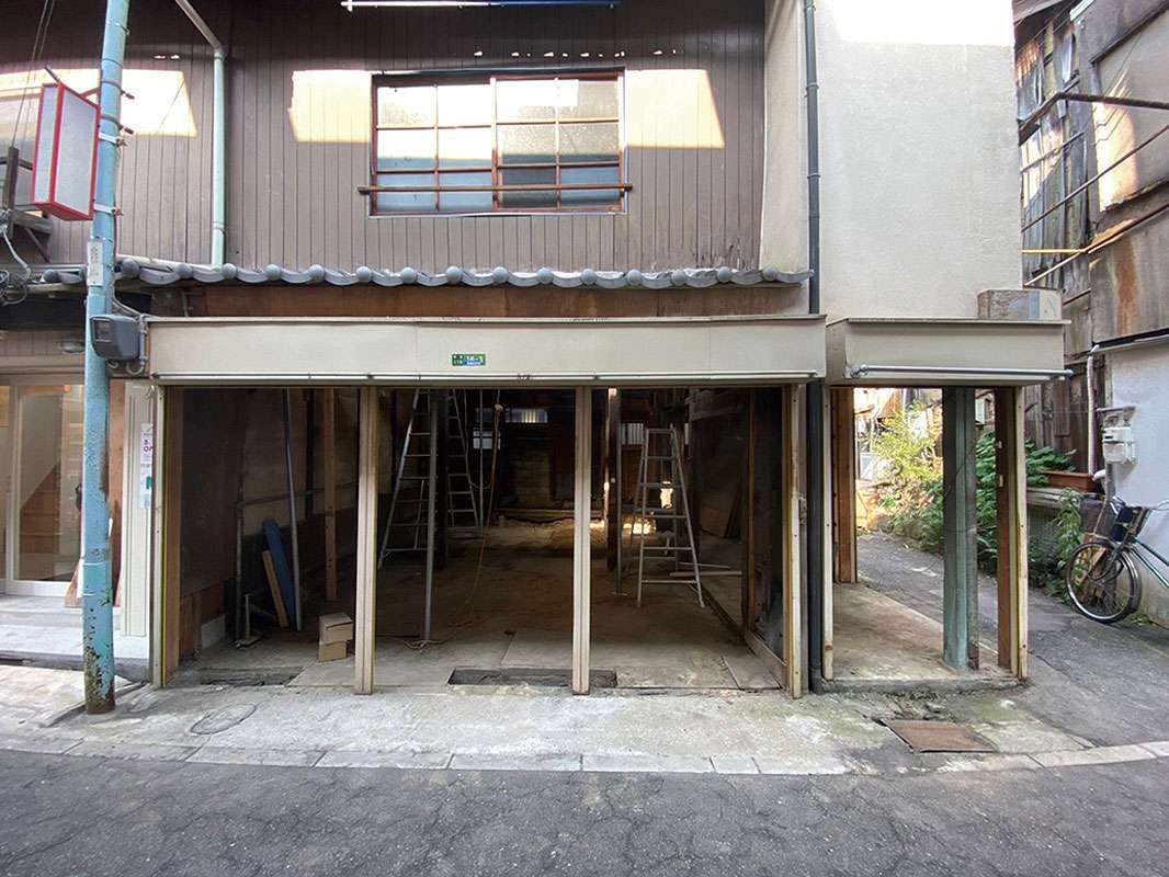 | 「ススス」のファサード。サインと目隠しを兼ねた暖簾が特徴的(左)。解体直後の様子。スケルトン状態にしてから施工(右) | |