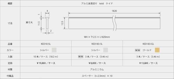 森田アルミ工業(大阪府阪南市)は、アルミ床見切り「keid(ケイド)」に新色ゴールドを追加して受注を開始した。