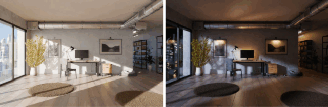 日中の居住空間(左)と夜間の居住空間。この2枚を使って動画を生成する。動画は同社ホームページで閲覧可能
