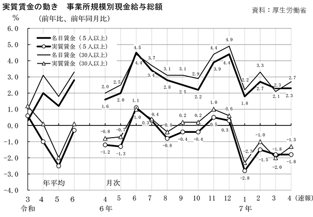 全産業平均は現金給与総額が30万2453円(同2.3%増)となり、40カ月連続の増加。一方で、実質賃金指数(※名目賃金指数を消費者物価指数で除して算出)は同1.8%減の83.7となり、低迷が続いている。