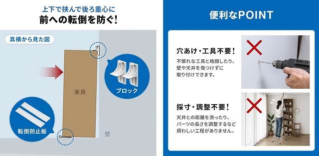 ブロックと転倒防止板を組み合わせることで、確実に転倒防止することが可能。穴あけや工具が不要で、賃貸でも壁や天井を傷つけずに取り付けることができる。震度6強まで対応の耐震試験済み商品。突っ張り棒による地震対策と比較して、天板をすっきり広く使用できる。
