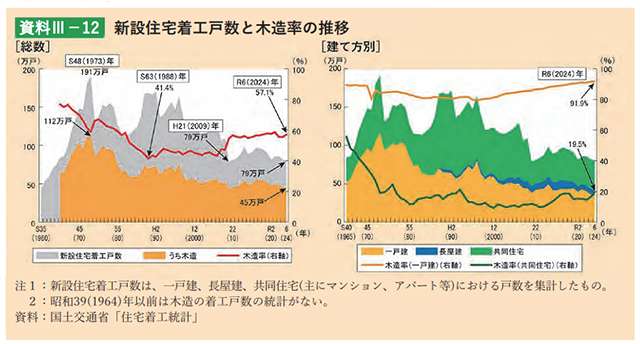 2024年の新設住宅着工戸数は前年比3.4%減の79万戸で、このうち木造住宅が同0.5%減の45万戸となった。新設住宅着工戸数に占める木造住宅の割合(木造率)は、一戸建て住宅では91.9%と高かった。工法別のシェアは、木造軸組工法(在来工法)が76.6%、ツーバイフォー工法が21.0%、木質プレハブ工法が2.4%となっている。