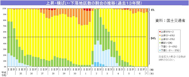 国土交通省は6月12日、主要都市の高度利用地など全国80地区における2025年1月1日~4月1日(25年第1四半期)の地価動向を調査した「地価LOOKレポート」を公表。5期連続で全80地区で地価が上昇した。住宅地は12期連続、商業地は5期連続での上昇となった。上昇率は「上昇(3~6%)」が5地区、「上昇(0~3%)」が75地区となっている。