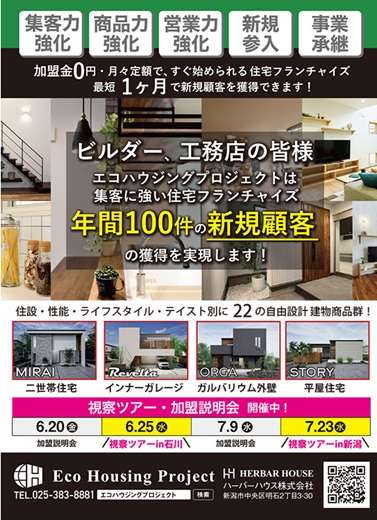 ハーバーハウス(新潟市)が運営する住宅フランチャイズ「エコハウジングプロジェクト」は、年間100件の新規顧客の獲得を実現できる「集客に強い」フランチャイズとして、現在、全国の工務店・ビルダーの加盟店参加を募集している。