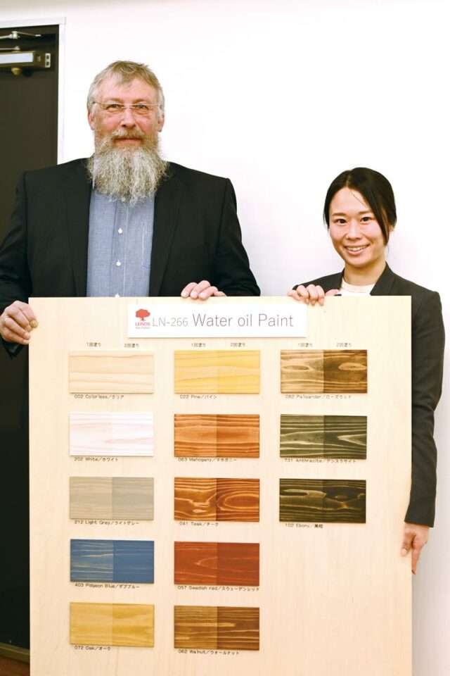 天然の安全性と高い機能性を両立するレイノス社の製品を通じて“自然塗料2.0”の市場をつくっていきたいと意気込むブランドマネージャーの山本悠加さん(右)と、レイノス本社・アジア担当のスヴェン・メルテンさん。2人が掲げ持っているのは「国内にはまだない革新的な製品」として提供していく、屋内外に使用できる天然水性塗料・ウォーターオイルペイントのサンプル