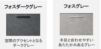 新たに、求めやすい価格帯に、インテリアトレンドを反映した扉カラーの新色として、空間のアクセントになる「フォスダークグレー」と木目と調和する「フォスグレー」をラインアップ。