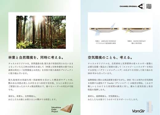 また、温熱環境に関わる商品開発にも力を入れている。特に2013年からは「エコロジーとエネルギーを両立する住宅」を掲げ、自然素材と世界標準の省エネルギー建築に必要な設備・製品を提案。2021年には室内の空気環境を改善する通気ドアVanAir(ヴァンエアー)の販売を開始。これまで難しいとされてきた居室間の換気に対し、優れた通気性と吸音性で、心地よい空気環境を実現。素材も、温熱環境も、空気環境も、家づくりのすべてをサポートしている。